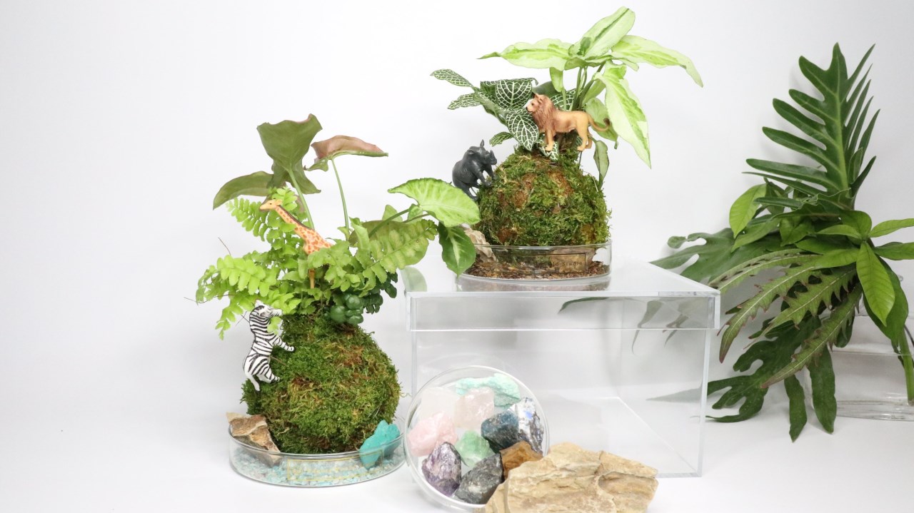 綠色的苔癬上長著一顆美麗的植物,幫您淨化空氣,搭配上淨化負能量,搭配水晶,碎石底座,最後在苔球上插上可愛的草原動物。